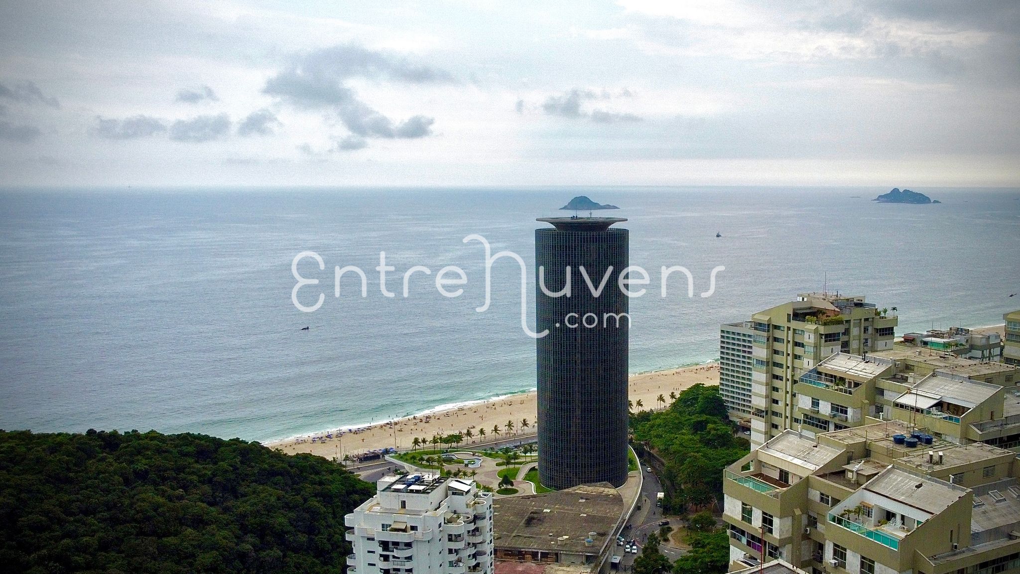 Imagem aérea feita por drone mostrando o icônico Hotel Nacional, marco da arquitetura modernista de Oscar Niemeyer, localizado em São Conrado, Rio de Janeiro. Ao fundo, a bela praia de São Conrado e o mar azul completam o cenário tropical, retratando a harmonia entre urbanismo, natureza e turismo de alto padrão na zona sul carioca.